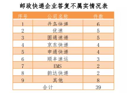5.邮政快递企业对省级邮政管理机构转办的申诉未能如实回复的有39件,环比增加19件。