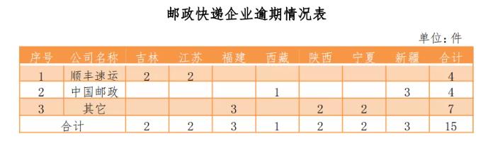 4.邮政快递企业对省级邮政管理机构转办的申诉未能按规定时限回复的有15件,环比增加6件。