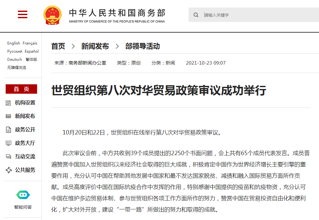 据商务部网站23日消息,10月20日和22日,世贸组织在线举行第八次对华贸易政策审议。此次审议会前,中方共收到39个成员提出的2250个书面问题,会上共有65个成员代表发言。成员普遍赞赏中国加入世贸组织以来经济社会取得的巨大成就,积极肯定中国作为世界经济增长主要引擎的重要作用,充分认可中国在帮助其他发展中国家和最不发达国家脱贫、减债和融入国际贸易方面所作贡献。