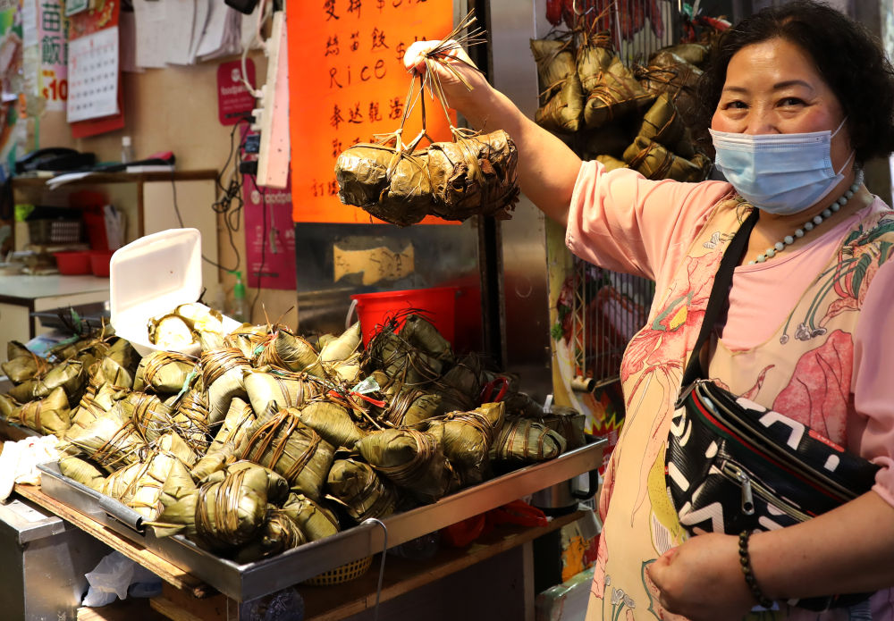 2021年6月12日,香港湾仔街市的商贩在叫卖粽子。新华社记者吴晓初摄