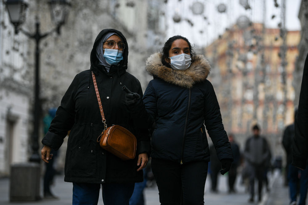 10月20日,在俄罗斯首都莫斯科,人们戴口罩出行。(新华社发,叶甫盖尼·西尼岑摄)