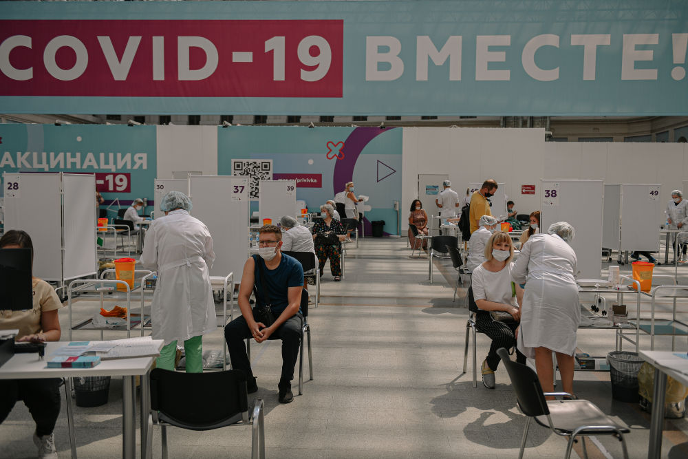 8月4日,人们在俄罗斯首都莫斯科红场附近一个新冠疫苗接种中心接种疫苗。(新华社发,叶甫盖尼·西尼岑摄)