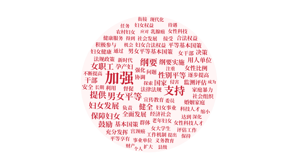 《中国妇女发展纲要(2021-2030年)》词云。(图片来源:新华社技术局闻新数智工作室)