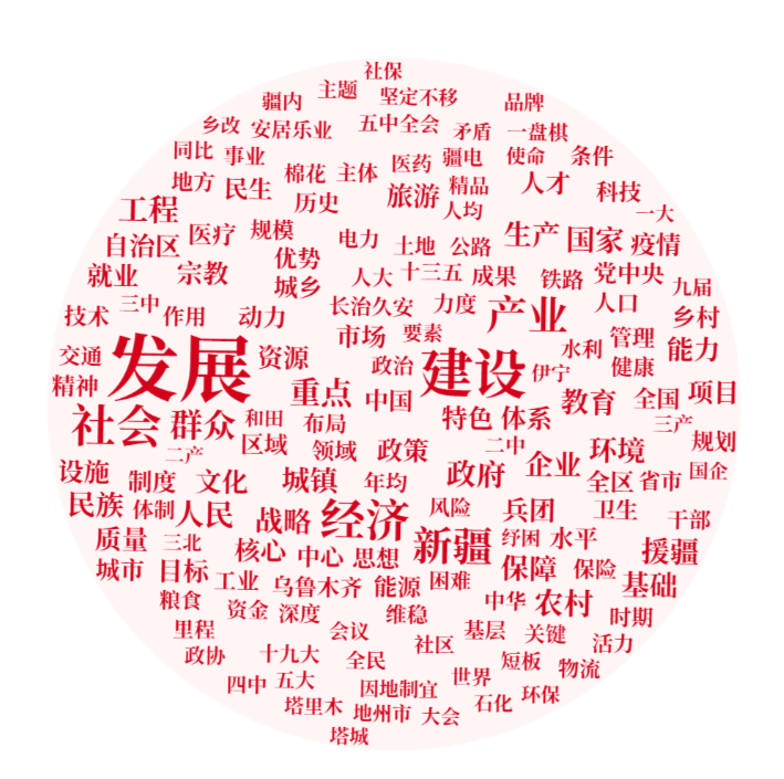 2020年度新疆维吾尔自治区政府工作报告词云。(图片来源:新华社技术局闻新数智工作室)