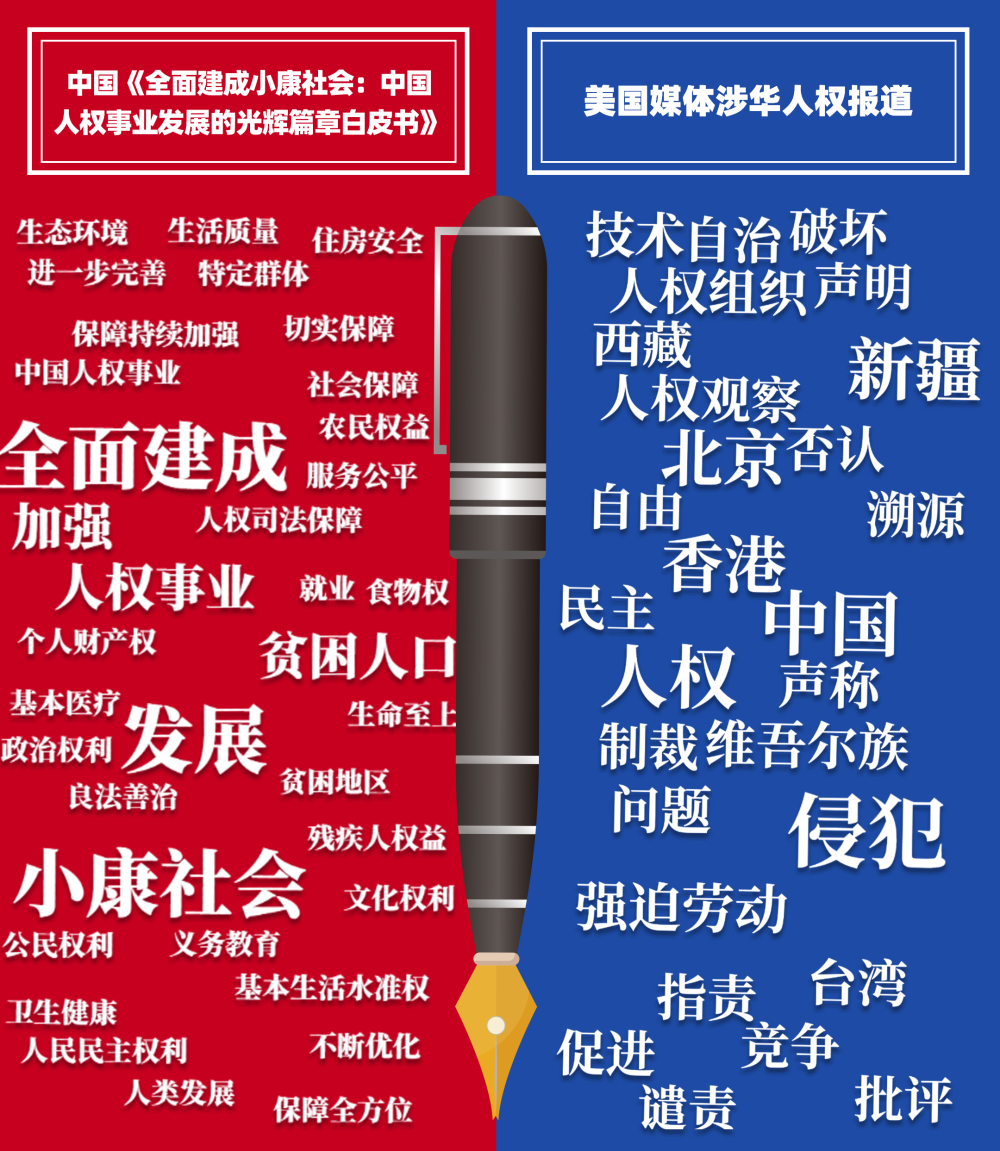 中国《全面建成小康社会:中国人权事业发展的光辉篇章白皮书》与美国媒体涉华人权报道词云对比。(图片来源:新华社技术局闻新数智工作室)