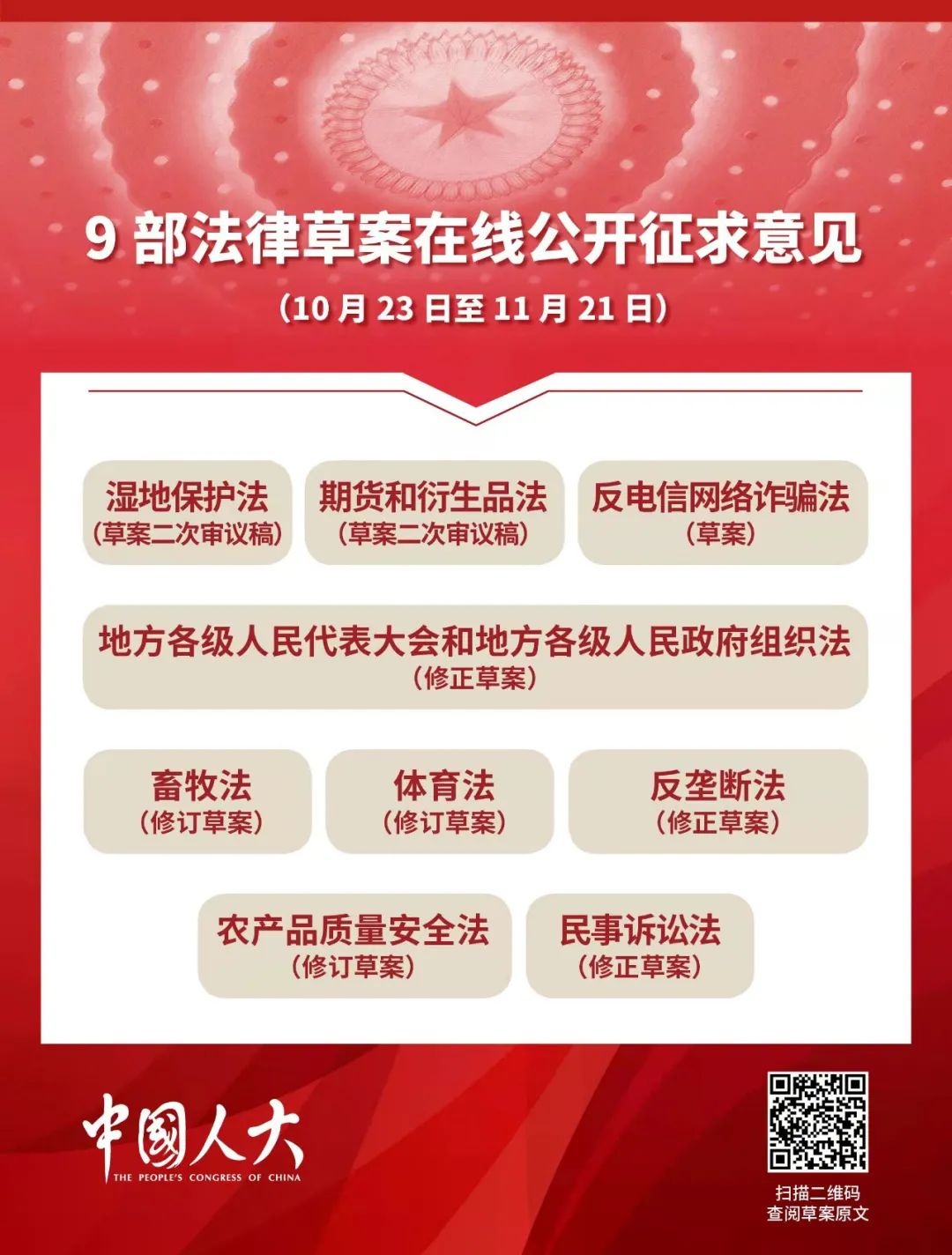 据“全国人大”微信公众号消息,近日,十三届全国人大常委会第三十一次会议审议了以上法律草案。从今天(10月23日)起,这9部法律草案在中国人大网公布,公开征求社会公众意见。征求意见截至2021年11月21日。