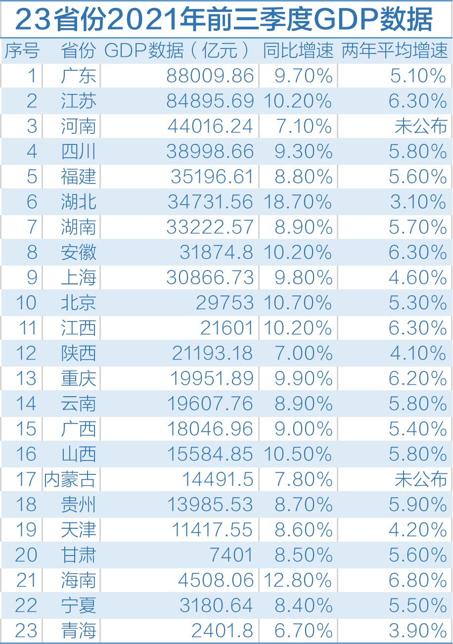 澎湃新闻梳理发现,目前已有23个省份公布了2021年前三季度GDP数据。