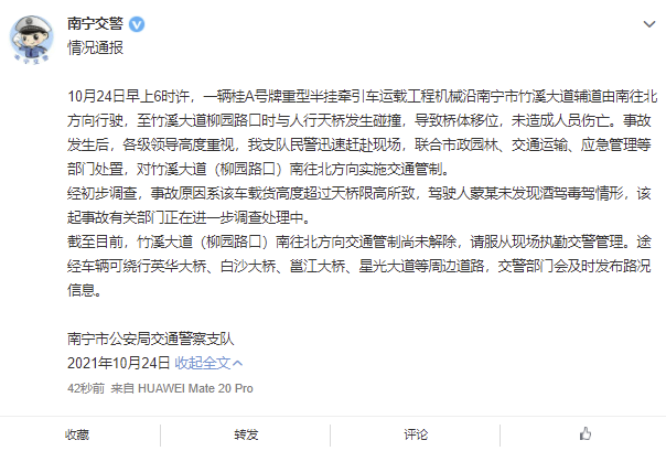 南宁市公安局交通警察支队通报,10月24日早上6时许,一辆桂A号牌重型半挂牵引车运载工程机械沿南宁市竹溪大道辅道由南往北方向行驶,至竹溪大道柳园路口时与人行天桥发生碰撞,导致桥体移位,未造成人员伤亡。事故发生后,各级领导高度重视,该支队民警迅速赶赴现场,联合市政园林、交通运输、应急管理等部门处置,对竹溪大道(柳园路口)南往北方向实施交通管制。
