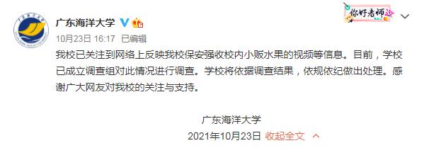 据广东海洋大学官方微博10月23日通报,该校已关注到网络上反映该校保安强收校内小贩水果的视频等信息。目前,学校已成立调查组对此情况进行调查。学校将依据调查结果,依规依纪做出处理。