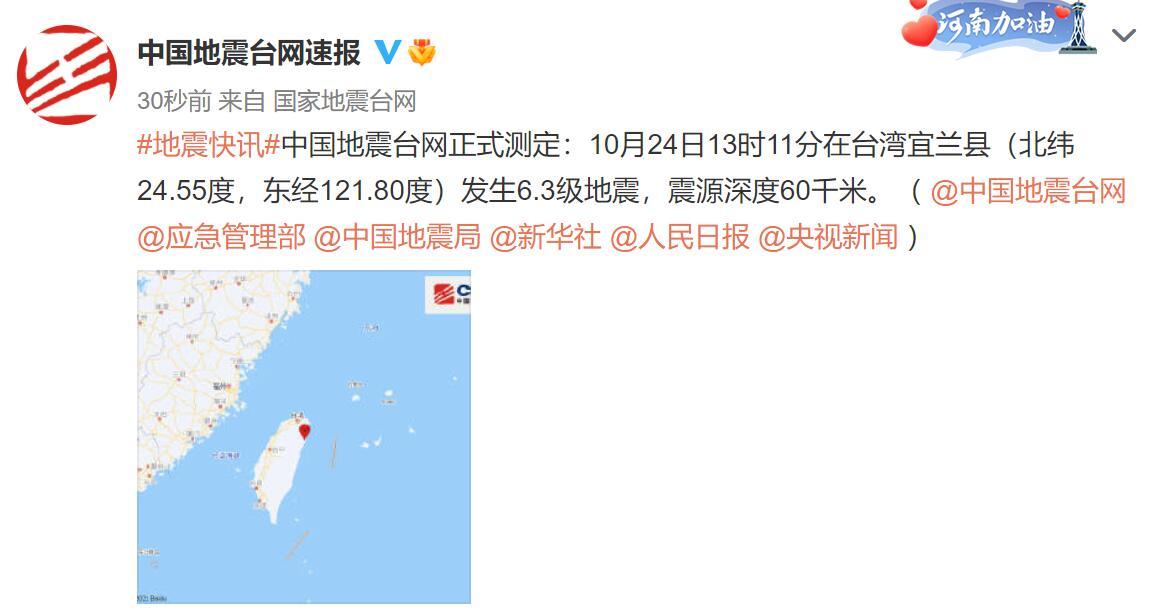 中国地震台网正式测定:10月24日13时11分在台湾宜兰县(北纬24.55度,东经121.80度)发生6.3级地震,震源深度60千米。