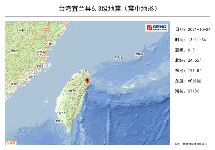 中国地震台网正式测定:10月24日13时11分在台湾宜兰县(北纬24.55度,东经121.80度)发生6.3级地震,震源深度60千米。