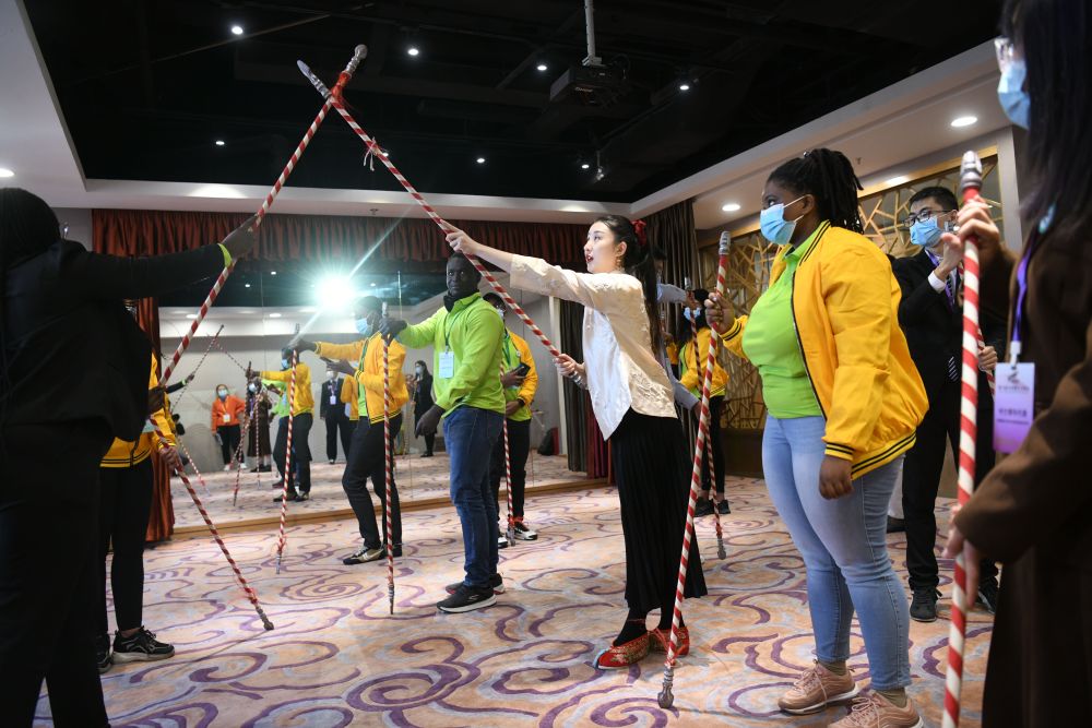 ↑ 2021年10月19日,参加第六届中非青年大联欢的青年在北京中国宋庆龄青少年科技文化交流中心参加京剧、中医、雅乐、刺绣、印染等中国传统文化体验活动。新华社记者 金良快 摄