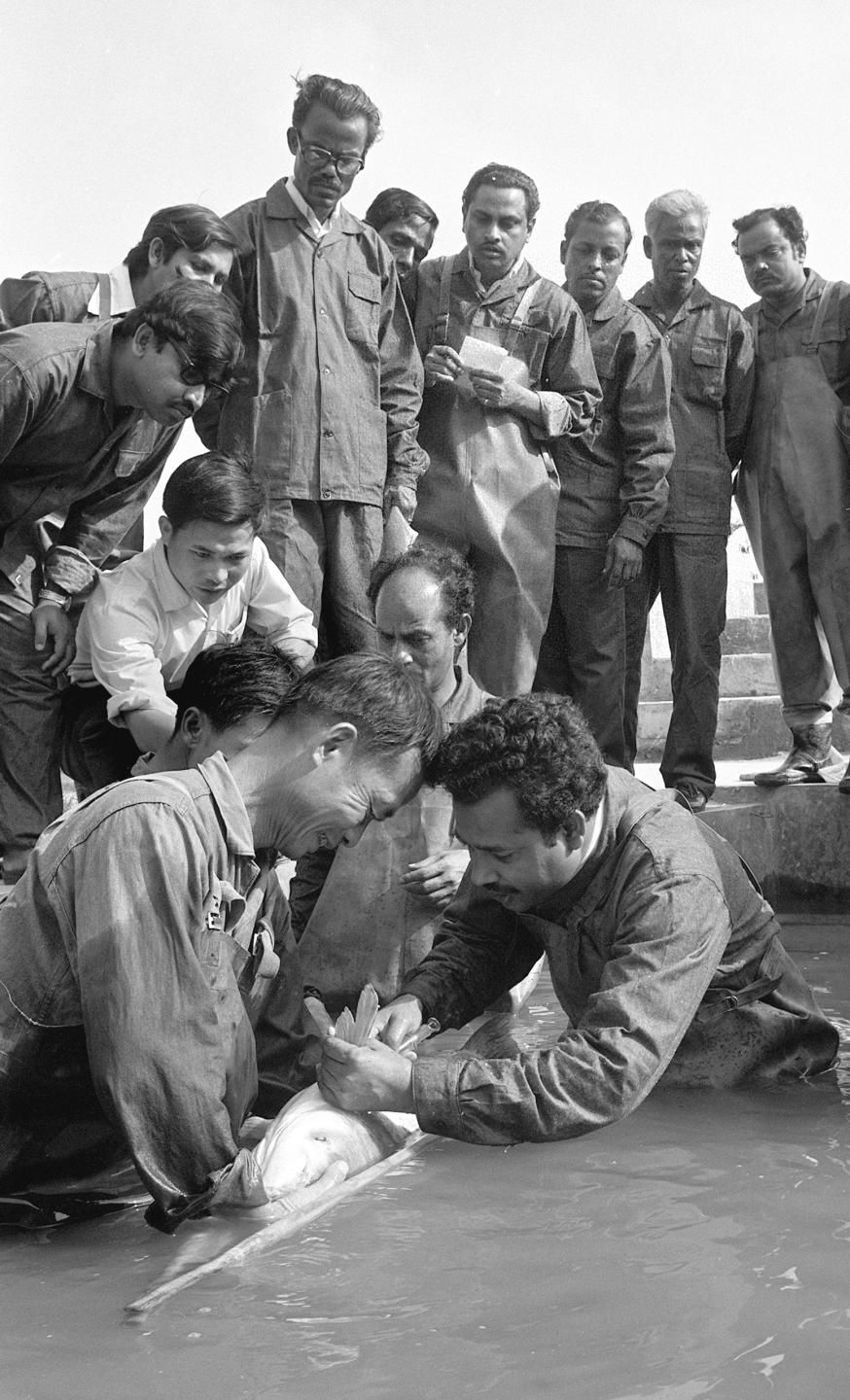 ↑ 1978年5月,中国为联合国开发计划署和联合国粮食及农业组织举办淡水养鱼培训班,学员在广州学习给雌鱼注射药液。新华社记者陈学思摄