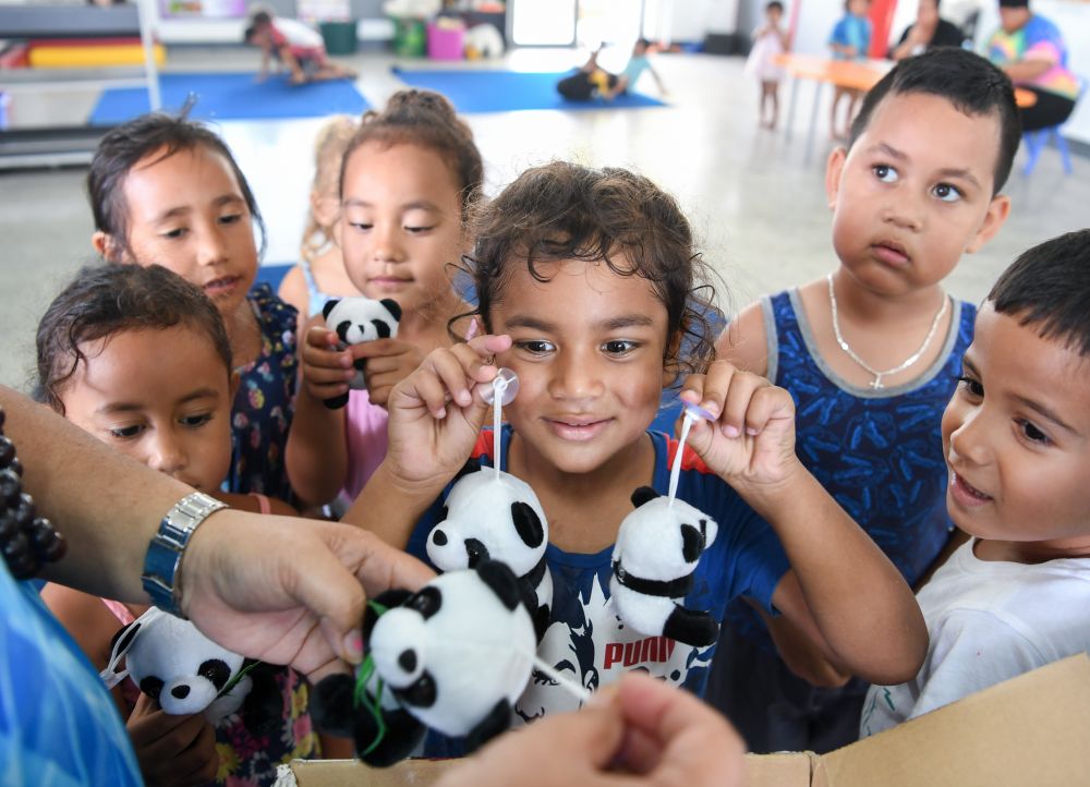↑ 2019年10月26日,在库克群岛首都阿瓦鲁阿,中国援建的阿皮尼考学校中的孩子手拿来自中国的熊猫挂件。新华社记者郭磊摄