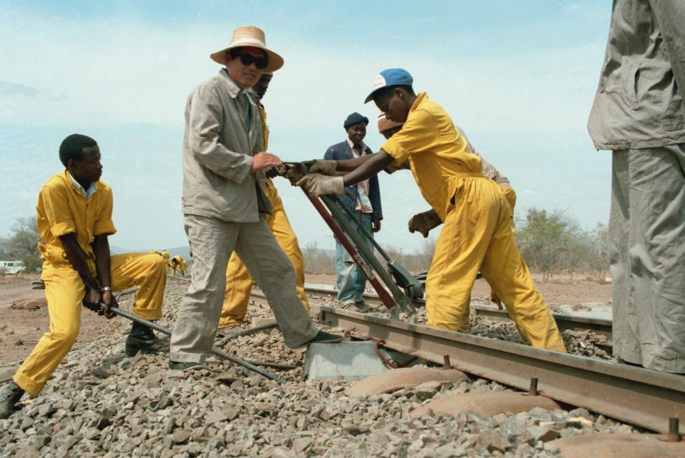 ↑ 1985年12月,沈阳铁路局派出的铁路工作组援助博茨瓦纳更新位于该国首都哈博罗内附近一段120公里长的铁路线。新华社记者徐长银摄