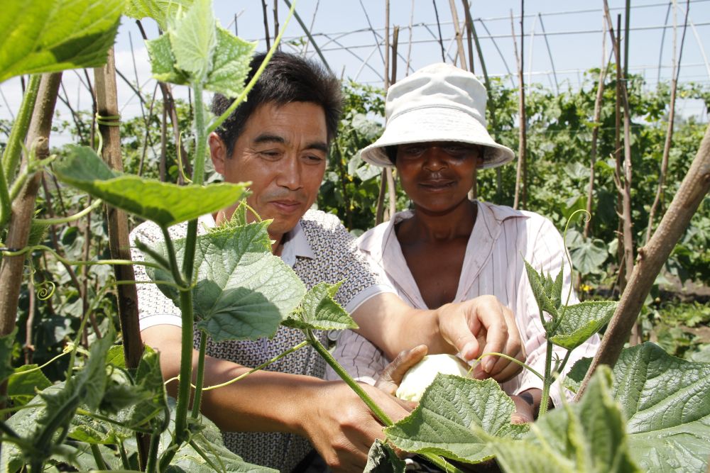 ↑ 2015年11月5日,在莫桑比克马普托省博阿内地区,中莫农业技术示范中心主任田泽勤传授当地农民种植技术。新华社记者李晓鹏摄