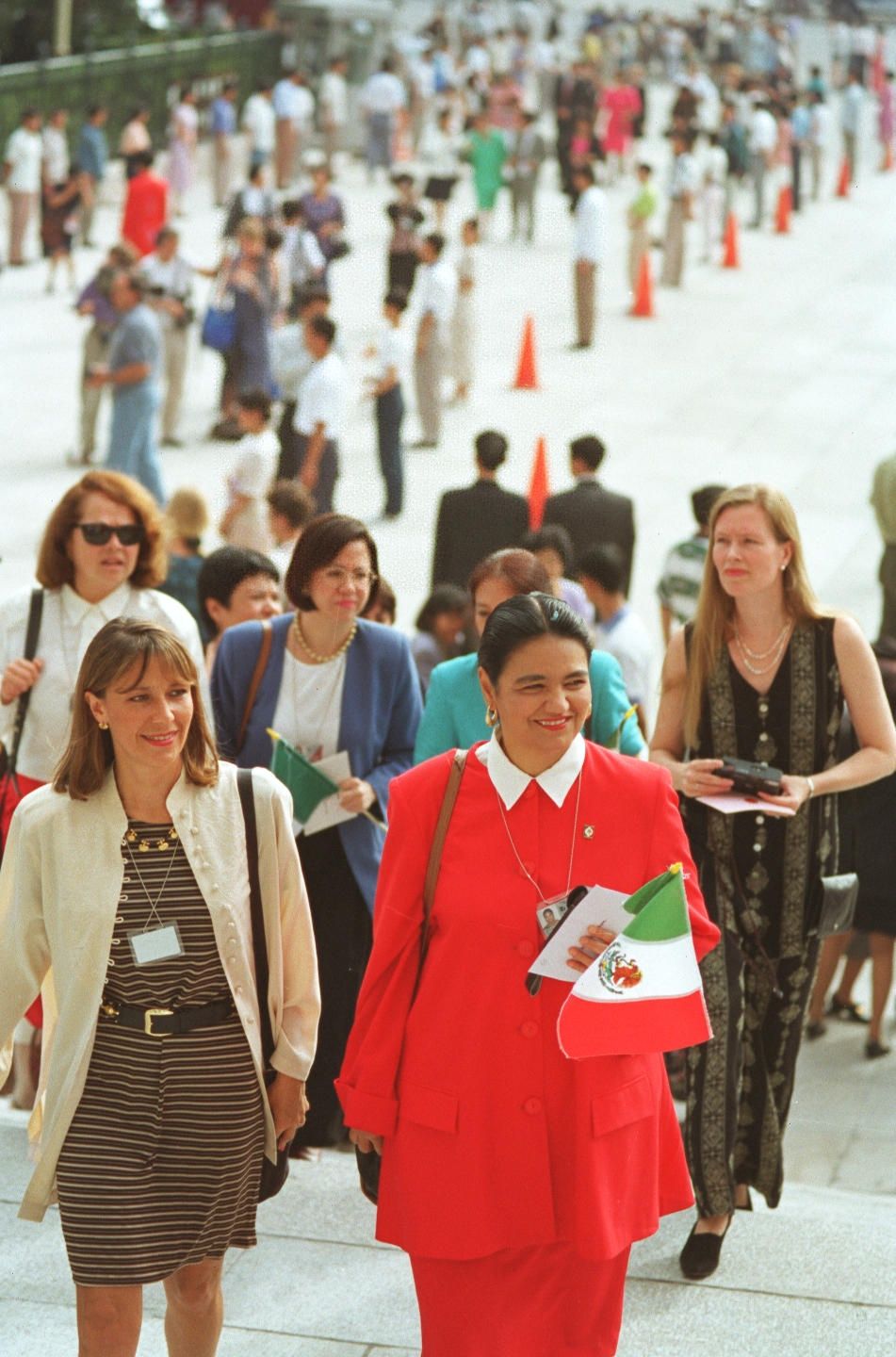 ↑ 1995年9月4日,各国妇女在北京人民大会堂参加联合国第四次世界妇女大会欢迎仪式。新华社记者张旭摄