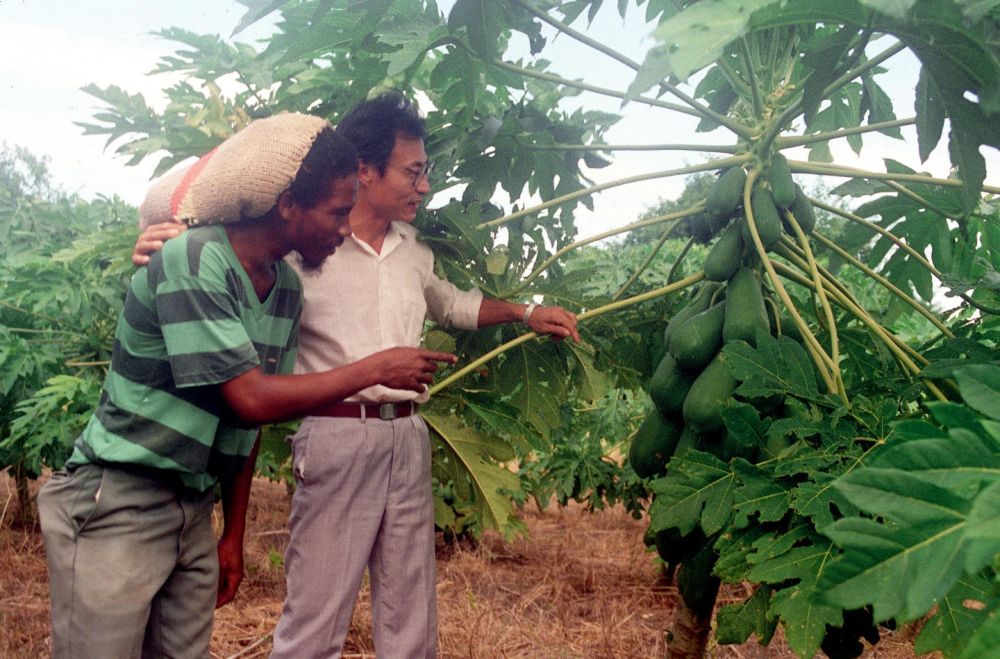 ↑ 20世纪90年代初,中国派往安提瓜和巴布达的农业技术人员帮助当地农民利用先进技术试种木瓜成功,木瓜产量大幅提升。 新华社记者 王葵 摄