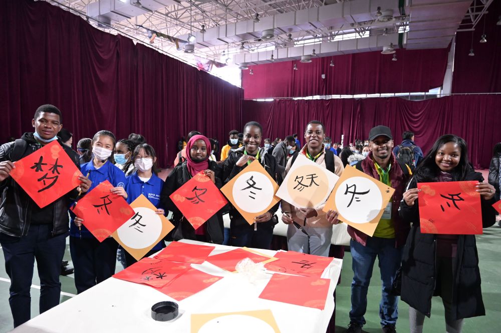↑ 2021年10月21日,在北京中非青年大联欢活动中,非洲青年在八达岭国际会展中心写毛笔字。新华社发