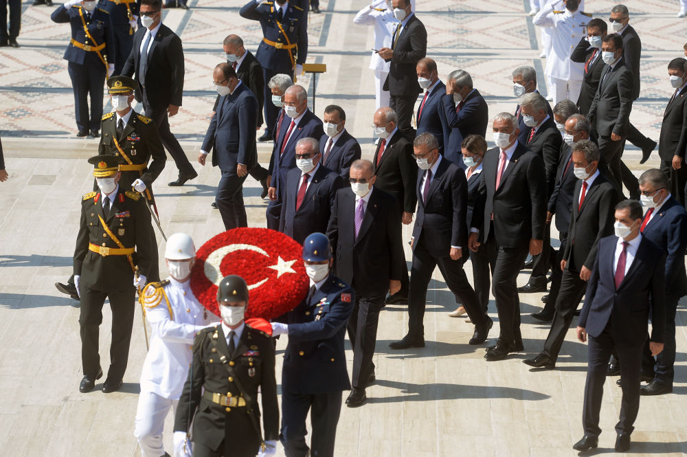 8月30日,在土耳其首都安卡拉,埃尔多安(中)出席“胜利日”活动,纪念土耳其民族解放战争胜利99周年。(新华社发,穆斯塔法·卡亚摄)
