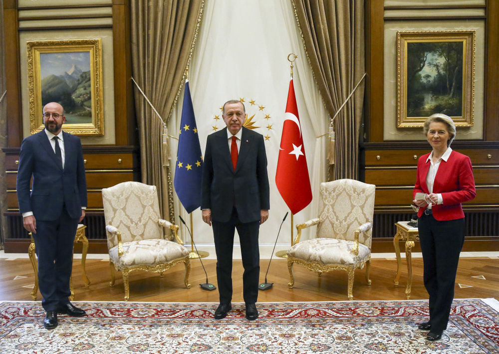 4月6日,土耳其总统埃尔多安(中)会见到访的欧洲理事会主席夏尔·米歇尔(左)和欧盟委员会主席乌尔苏拉·冯德莱恩。(新华社发,穆斯塔法·卡亚摄)