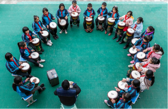 贵州省黔西市林泉镇高锦小学学生在练习手鼓。