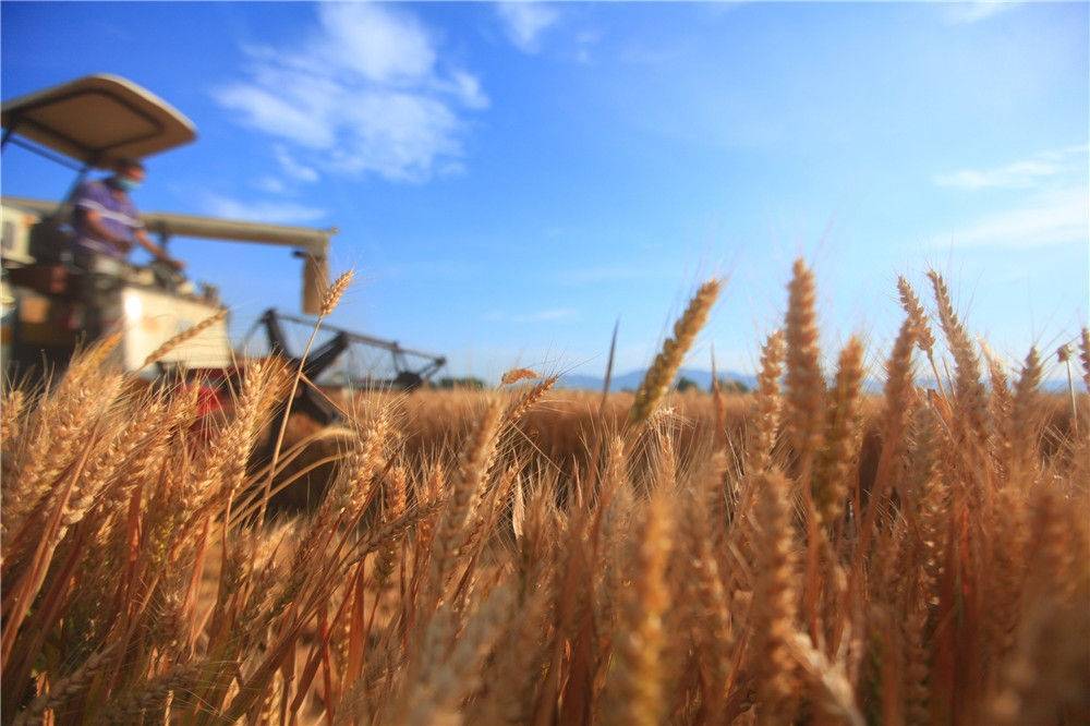6月8日,收割机在山东省临沂市平邑县的麦田里收割小麦。新华社发(武纪全 摄)