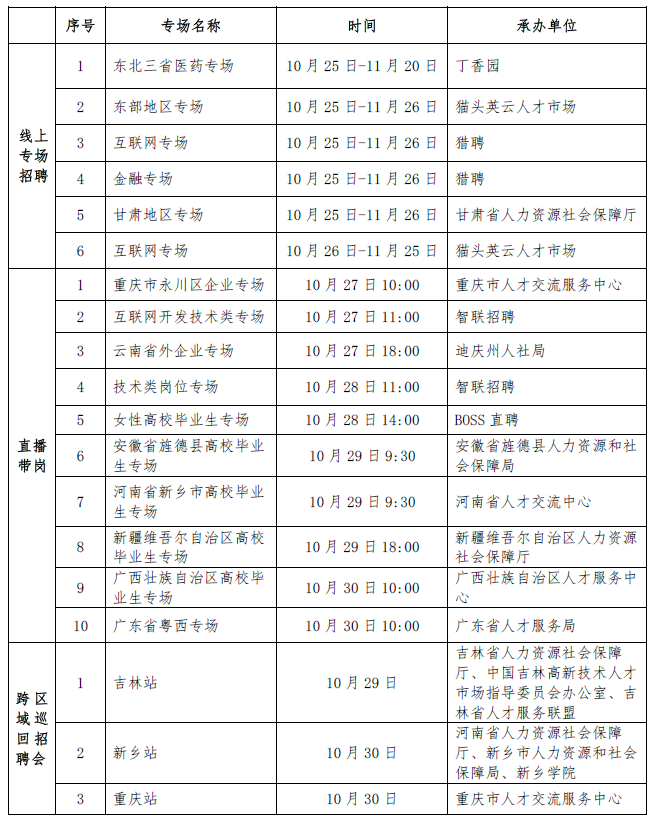 线下活动3场:举办吉林站、新乡站、重庆站3场跨区域巡回招聘会,除本地用人单位外,将邀请外省市人社部门组织用人单位组团参加。