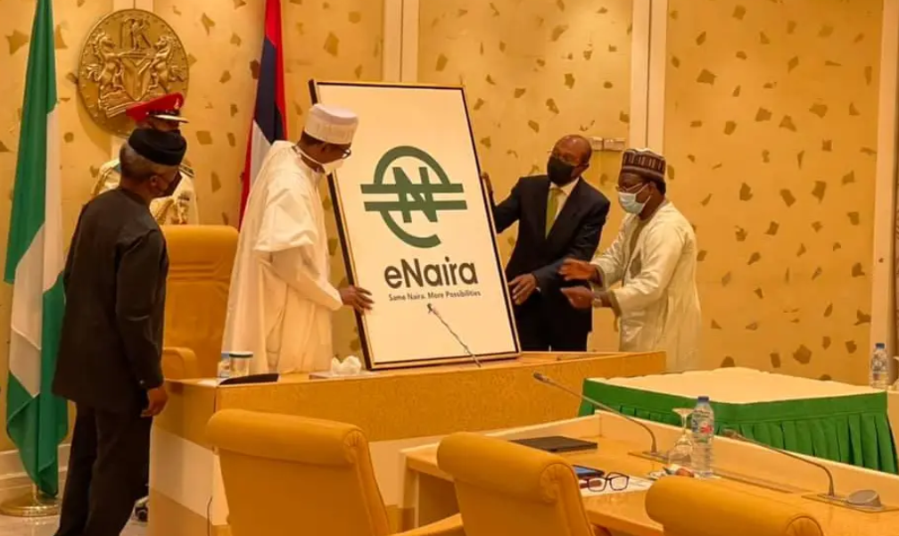 当天,尼日利亚总统布哈里在总统府与尼央行行长戈德温一道为eNaira揭幕,正式宣告该国数字货币启动。