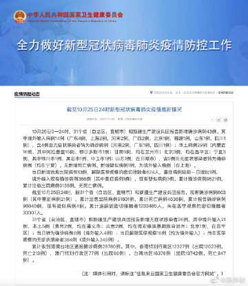 【#10月25日新增确诊病例43例# #10月25日新增本土病例29例#】据国家卫生健康委员会网站,10月25日0—24时,31个省(自治区、直辖市)和新疆生产建设兵团报告新增确诊病例43例。其中境外输入病例14例(广东4例,上海2例,河南2例,广西2例,北京1例,福建1例,山东1例,四川1例),含4例由无症状感染者转为确诊病例(河南2例,广东1例,四川1例);本土病例29例(内蒙古16例,其中阿拉善盟15例、鄂尔多斯市1例;甘肃6例,均在兰州市;北京3例,均在昌平区;宁夏3例,其中银川市1例、吴忠市1例、中卫市1例;山东1例,在日照市),含2例由无症状感染者转为确诊病例(均在宁夏)。无新增死亡病例。新增疑似病例1例,为境外输入病例(在上海)。