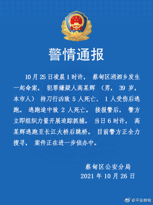 武汉警方:男子持刀致5死1伤逃跑途中再致2死,嫌犯已跳桥