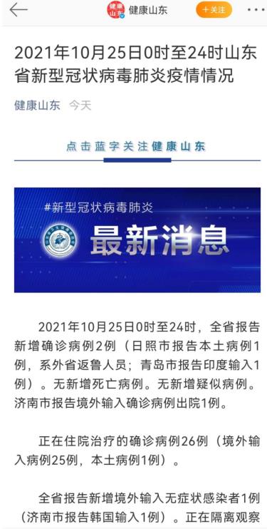 央视网消息 (记者 李文亮):10月25日0时至24时,山东省报告新增确诊病例2例,其中日照市报告本土病例1例,系外省返鲁人员;青岛市报告印度输入1例。