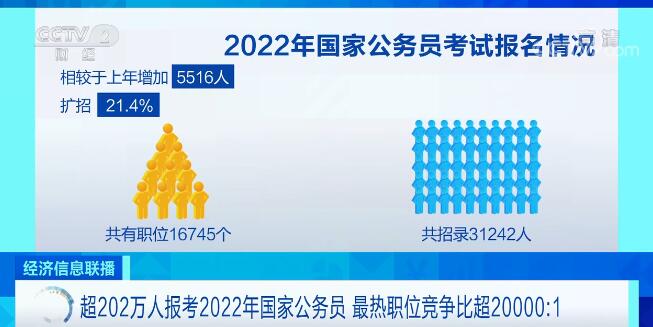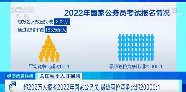 央视网消息:2022年国家公务员考试报名在24日18时结束,截至24日17时50分,总报名人数已突破202万,183万余人通过资格审查,创国家公务员考试人数新高;平均竞争比超过60比1,最热职位竞争比超过20000比1。