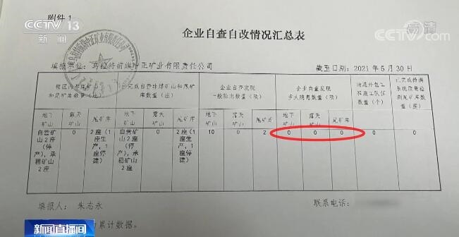国家矿山安全监察局非煤矿山司一级主任科员 吴任欧:自查自改报上去的表只有时间不一样,每一个月的表(内容)都是一样的,连一般隐患数量都是一样的。尾矿库数量每次都是2,你们连续报了三个月,三个月只有日期不一样。