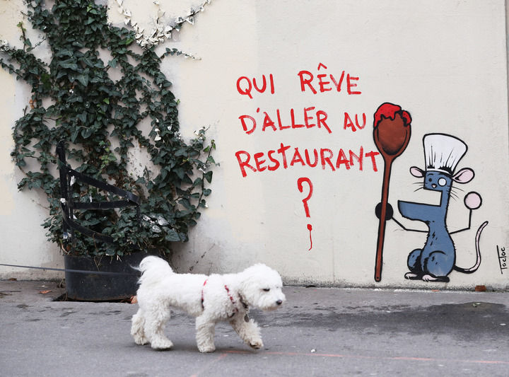 2月19日,一只小狗走过法国巴黎街头的一处涂鸦,上面写着“谁做梦都想去下馆子?”法国当时实施宵禁措施,餐馆和博物馆等公共场所持续关闭。(新华社记者高静摄)