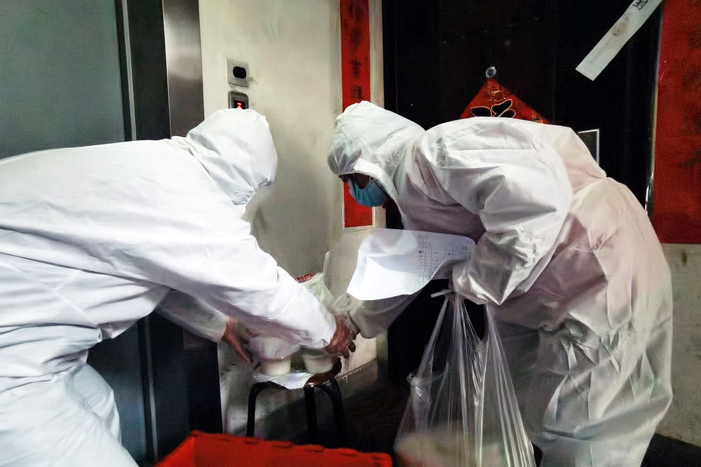 △10月26日,在兰州市城关区东湖小区,工作人员给住户配送免费餐食。