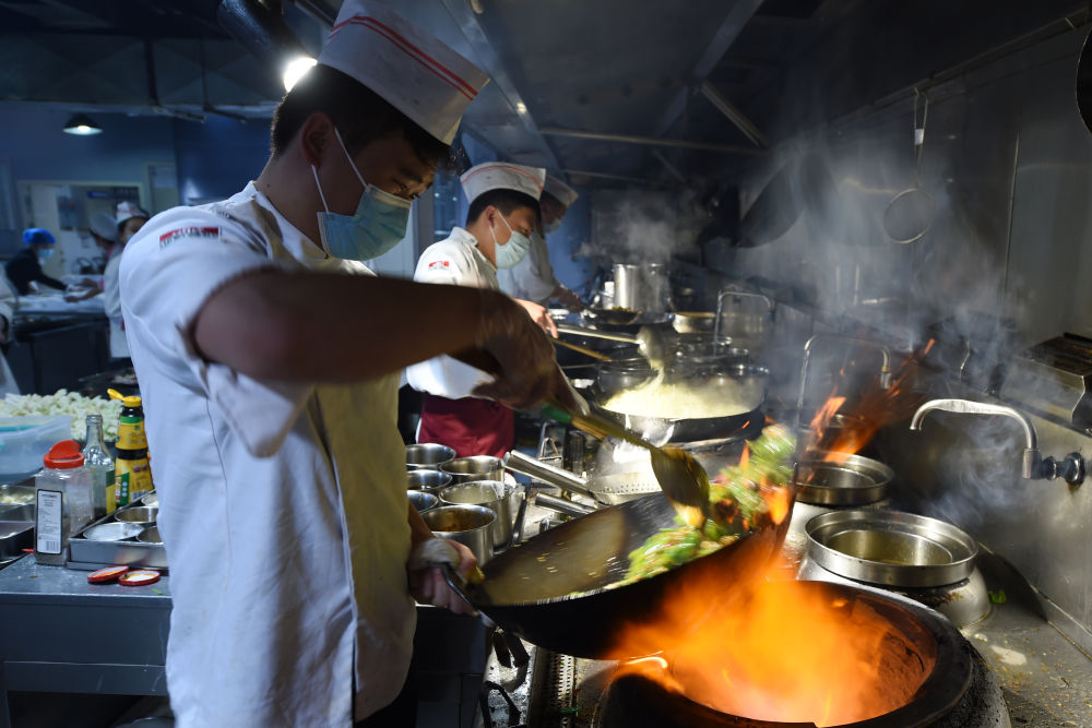 △10月25日,在兰州市城关区一家餐饮企业,工作人员在制作隔离人员餐食。