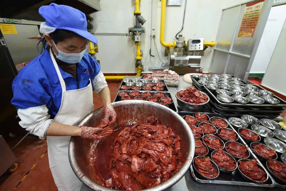 △10月26日,在兰州市安宁区一家餐饮集团的中央厨房,工作人员正在制作兰州糟肉。