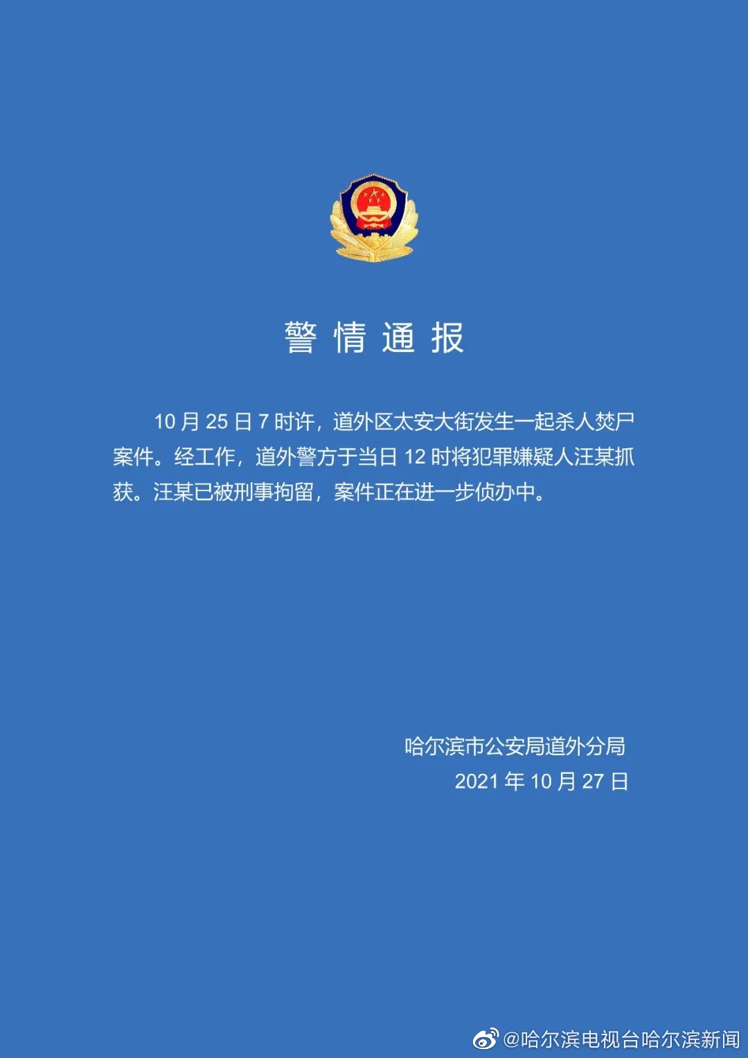 哈尔滨警方通报“道外区发生杀人焚尸案”:嫌疑人已被刑拘