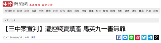 据台湾“中时新闻网”消息,台湾地区前领导人马英九被指控贱售国民党党产的“三中案”,2018年被台北地检署起诉。台北地方法院今天(27日)审结,判决马英九无罪。