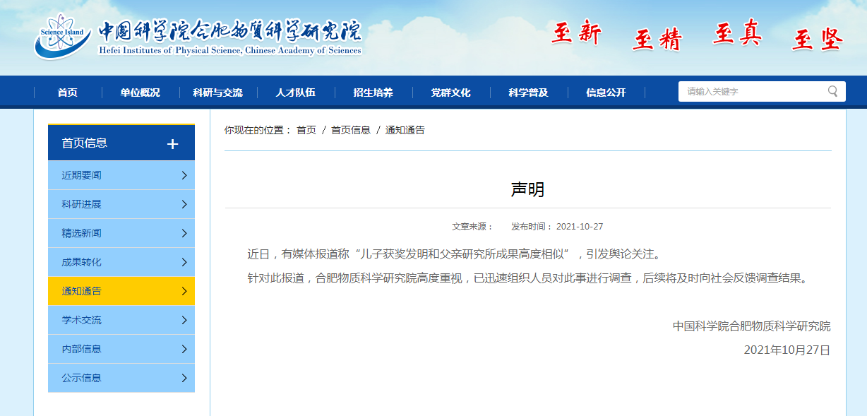 10月27日,中国科学院合肥物质科学研究院官网发布声明:近日,有媒体报道称“儿子获奖发明和父亲研究所成果高度相似”,引发舆论关注。针对此报道,合肥物质科学研究院高度重视,已迅速组织人员对此事进行调查,后续将及时向社会反馈调查结果。