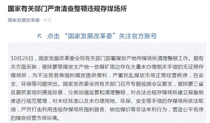 据国家发展和改革委员会微信公众号消息,10月26日,国家发展改革委会同有关部门部署煤炭产地存煤场所清理整顿工作。据有关方面反映,晋陕蒙等煤炭主产地一些煤矿周边存在大量未办理相关手续的无证照存煤场所,为不法贸易商囤积煤炭提供便利,严重扰乱煤炭市场正常经营秩序,且安全、环保等问题突出。国家发改委会同有关部门召开专题视频会议要求,晋陕蒙三省区要抓紧组织摸底排查,分类加强监管和清理整顿,对合法合规存煤场所建立报备制度进行规范管理,对未经批准以及未办理用地、环保、安全等手续的存煤场所依法取缔,严厉打击利用违规存煤场所囤积居奇、哄抬煤价等非法牟利行为,营造公平有序的煤炭经营市场环境。