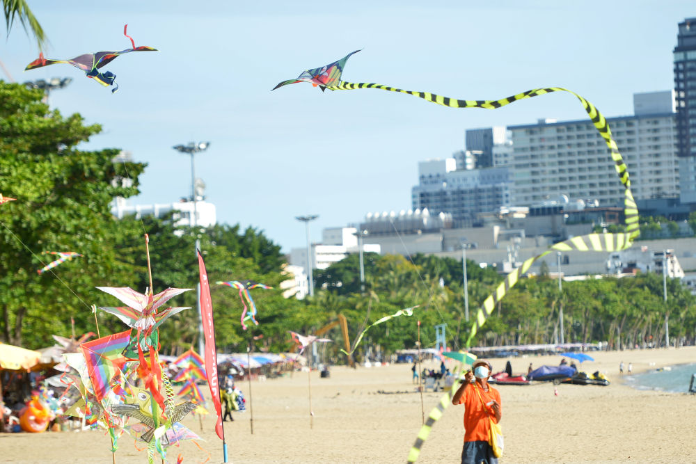6月24日,一名商贩在泰国春武里府芭堤雅海滩放风筝。(新华社发,拉亨摄)