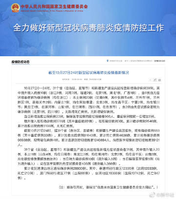 【#10月27日新增确诊病例39例# #10月27日新增本土病例23例#】据国家卫生健康委员会网站,10月27日0—24时,31个省(自治区、直辖市)和新疆生产建设兵团报告新增确诊病例39例。其中境外输入病例16例(浙江8例,河南3例,福建2例,北京1例,湖北1例,广西1例),含8例由无症状感染者转为确诊病例(均在浙江);本土病例23例(甘肃8例,其中张掖市4例,兰州市1例,兰州新区1例,嘉峪关市2例;内蒙古7例,均在阿拉善盟;北京3例,均在昌平区;宁夏2例,均在银川市;黑龙江1例,在黑河市;山东1例,在日照市;四川1例,在自贡市),含2例由无症状感染者转为确诊病例(北京1例,四川1例)。无新增死亡病例。无新增疑似病例。