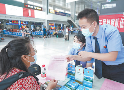 重庆市两江地区检察院组织法治宣讲团成员来到火车站,向旅客宣讲政法队伍教育整顿情况,宣传公益诉讼检察职能。张凡洁摄(人民视觉)