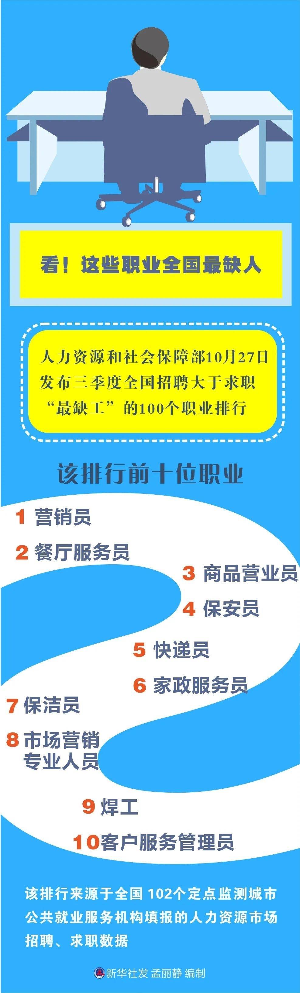 人力资源和社会保障部27日发布三季度全国招聘大于求职“最缺工”的100个职业排行,其中,营销员、餐厅服务员、商品营业员、保安员、快递员、家政服务员、保洁员、市场营销专业人员、焊工、客户服务管理员等职业位于该排行前十。