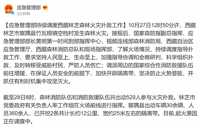 据@应急管理部 微博消息,10月27日12时50分许,西藏林芝市察隅县竹瓦根镇空档村发生森林火灾。接报后,国家森防指副总指挥、应急管理部部长黄明第一时间到部指挥中心,视频连线部森林消防局、西藏自治区应急管理厅、西藏森林消防总队和现场指挥部,了解火场情况,持续调度指导扑救工作,要求坚持人民至上、生命至上,加强指导协调和会商研判,科学组织扑救,及时转移受威胁村民,严防人员伤亡;调派周边的国家综合性消防救援队伍前往增援,在保证人员安全的前提下,加快开辟隔离带,坚决防止火势蔓延,并抓住有利时机集中攻坚灭火。