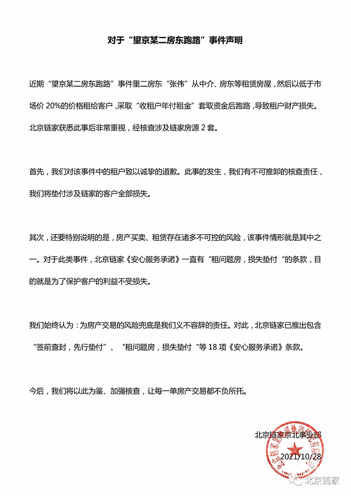 北京链家回应“望京某二房东跑路”事件:涉及链家房源2套,将垫付客户的全部损失