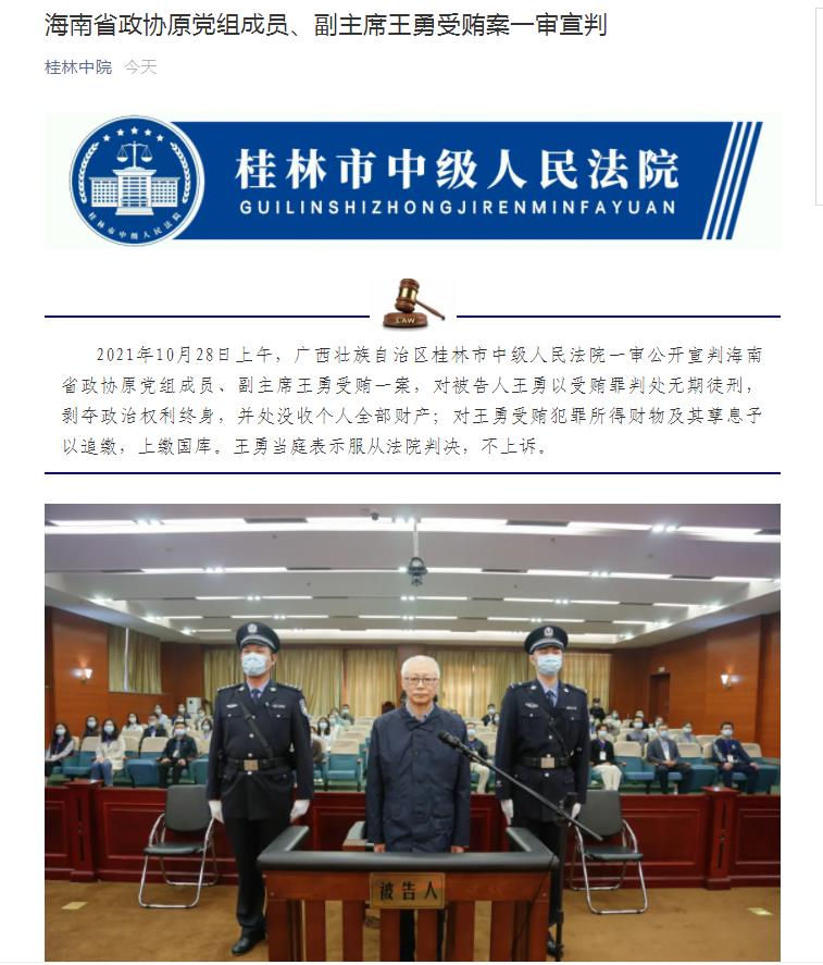 据“桂林中院”微信公众号消息,10月28日上午,广西壮族自治区桂林市中级人民法院一审公开宣判海南省政协原党组成员、副主席王勇受贿一案,对被告人王勇以受贿罪判处无期徒刑,剥夺政治权利终身,并处没收个人全部财产;对王勇受贿犯罪所得财物及其孳息予以追缴,上缴国库。王勇当庭表示服从法院判决,不上诉。