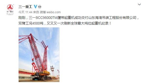 10月28日,三一重工宣布,其SCC98000TM履带起重机下线,这是全球最大吨位履带起重机。该履带起重机最大起重力矩超过9.8万吨/米,最大起重量4500吨,将主要应用于国家核电、石化建设领域。